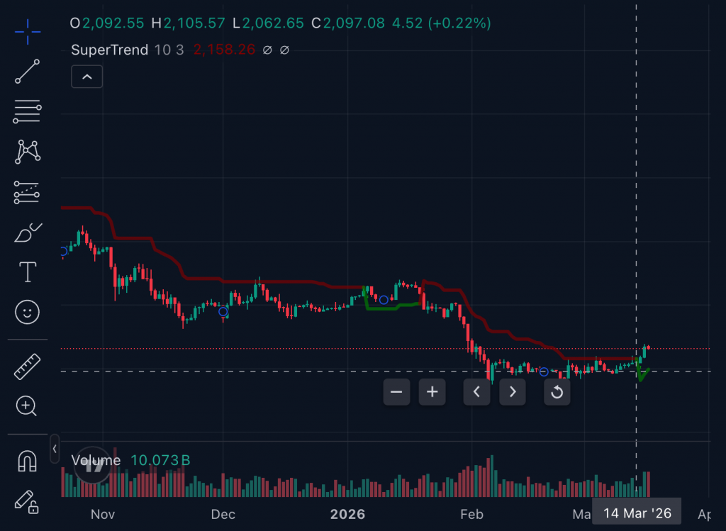 The key context: ETH had been trading below $2,100 for an extended period before breaking out above that level in mid-March. With the broader market also recovering (BTC reclaiming the $72,000 to $74,000 range, SOL up over 5%), ETH’s move had enough force behind it to finally close above the SuperTrend line.