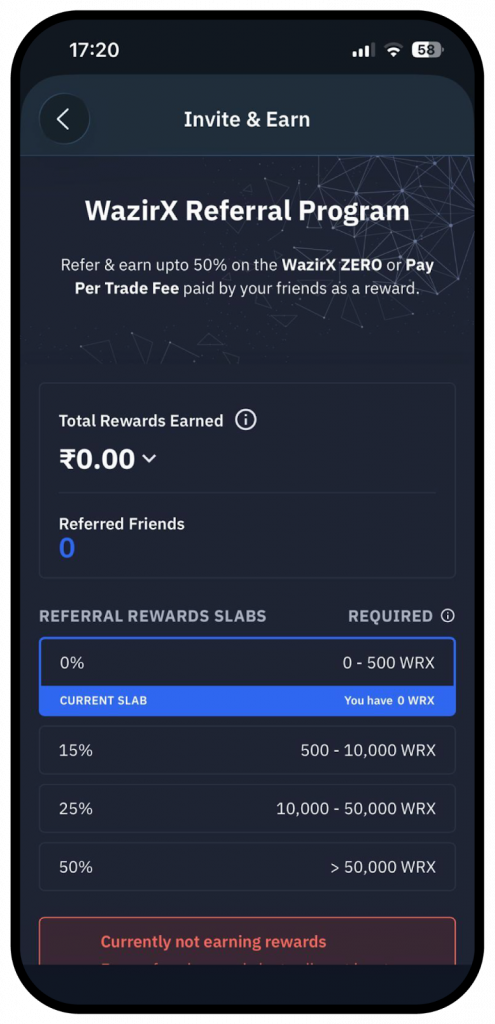 Since WazirX offers different trading models, WazirX ZERO and Pay Per Trade, your earning potential remains active and adjusts seamlessly based on the model your friend chooses. Please note that WazirX does not guarantee any minimum earnings.
