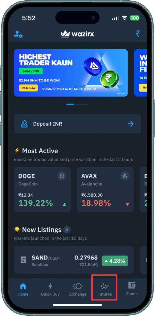 Step 1: Open the WazirX App on your phone, click on ‘Futures’ at the bottom, and select the Market of your choice.